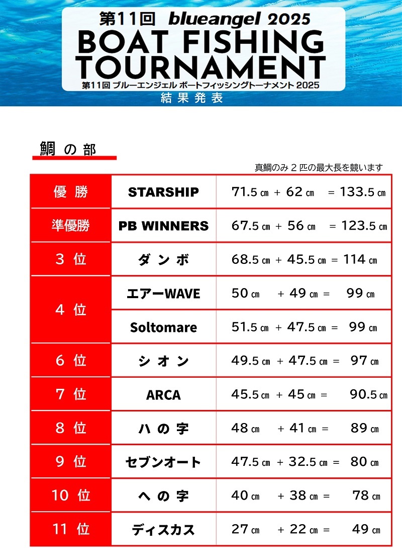 =速報=第11回 blue angel BOAT FISHING TOURNAMENT 2025ブルーエンジェルボートフィッシングトーナメント2025 |