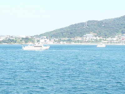 興居島伊予の小富士を背景に松山を後にするフェリーくるしま |