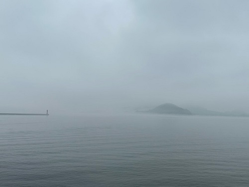 このデカい船体が、霧に吸い込まれていくように松山港を後にしました。 |