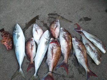 たくさんの大物魚が釣れました。しかも一番大きいタイ、ハマチ、ホゴを釣ったのは高校生のkenちゃん!