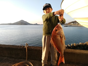 午前中、小型のタイを釣り上げて、叩くような強い引きに感動したそうです。